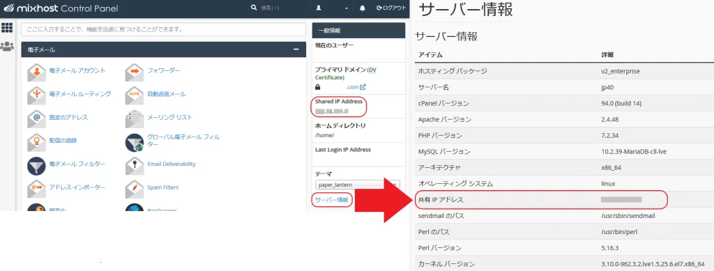 トラブルシューティング mixhost サーバーのIPアドレスを確認する方法 8月 8, 2020 この記事ではサーバーの共有IPアドレスとfilegetcontentsにて通信する際に使用するIPアドレスの確認方法を紹介します。 サーバーの共有IPアドレス サーバーの共有IPアドレスは以下の手順で確認可能です。 1.cPanelホームにログインしてください。 2.cPanel右側のメニューから「サーバー情報」をクリ... SAWADA