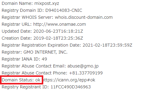 ドメインステータスの項目が「ok」になっていることを確認してください。