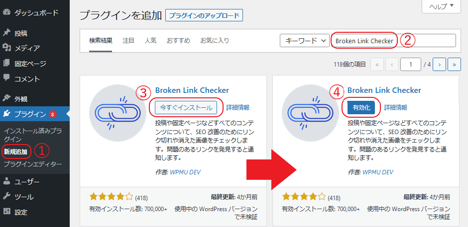ダッシュボードより「①プラグイン欄:新規追加」→「②キーワードに【Broken Link Checker】と入力」→「③【今すぐインストール】」→「④【有効化】」の順に選択しプラグインの有効化しましょう。