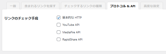 プロトコル&APIでは、リンクのチェックする手段を選択する設定で【基本的な HTTP 】を「有効」としその他(「YouTube API 」・「MediaFire API 」・「RapidShare API 」)についてはWordPress上でYouTube動画の埋め込みやファイルを共有できるサービス(MediaFire API やRapidShare API )を使用していれば「有効」としましょう。