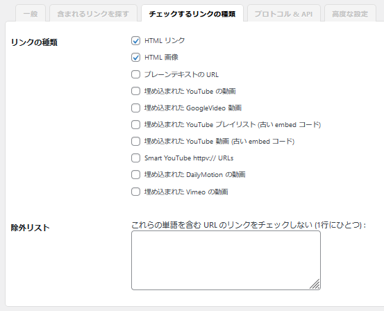 チェックするリンクの種類では、監視するリンクの種類を指定及び除外でき動画の埋め込みやアフィリエイトサイトへのリンク等が無ければデフォルトから変更は不要です。