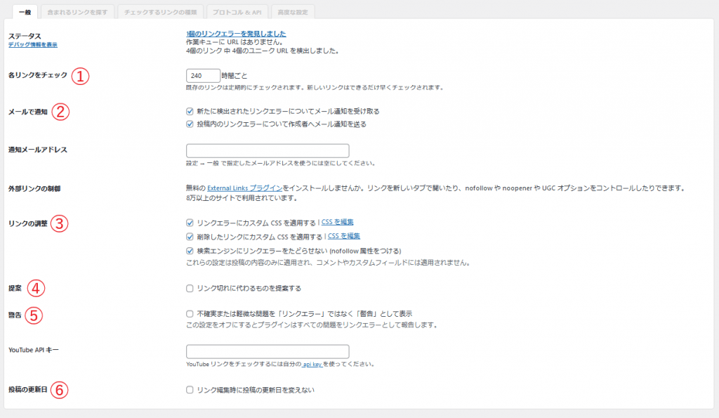 各リンクをチェックでは、本プラグインは定期的に既存のリンクがエラーを起こしていないか監視しておりその間隔を調整することができる設定であり、デフォルトでは「72時間ごと」と間隔が短いが記事の修正や一定期間のみリンク先を掲載する場合を除いてリンクエラーは発生しにくい為「168(7日)」や「240(10日)」時間ごとなど監視間隔を開けることをオススメします。