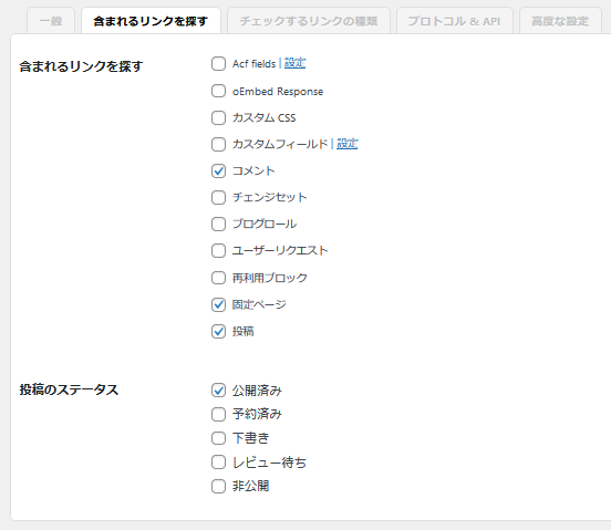 含まれるリンクを探すでは、Webサイト内のリンク監視する場所と対象の投稿のステータスを指定する設定でデフォルトから変更は不要です。