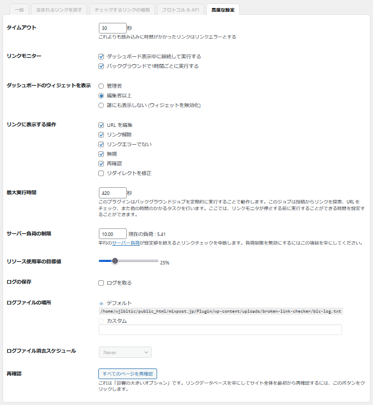 高度な設定では、プラグインの動作やシステムに関する設定が変更できデフォルトから設定の変更は不要となります。Webサイト全体に対しリンク切れのチェックを手動で開始する場合は「再確認:すべてのページを再確認」を選択しましょう。