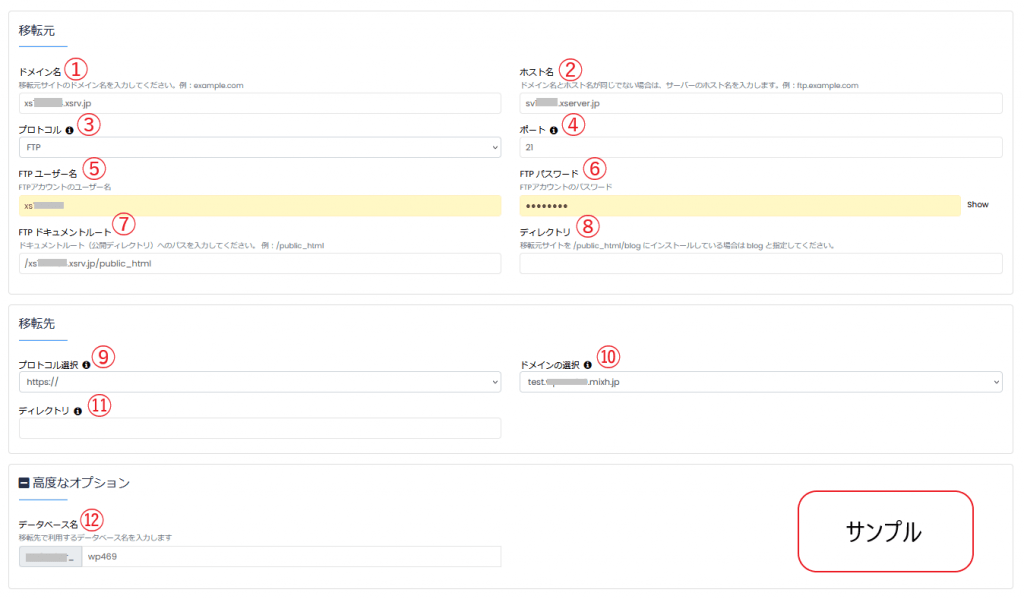 | ①ドメイン名 | 移転元のWebサイトのドメイン名を入力します。 | xs******.xsrv.jp |