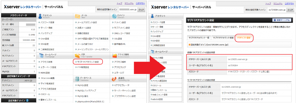 【②ホスト名】、【⑤FTPユーザー】、【⑥FTPパスワード】は、契約時の「サーバーアカウント設定完了のメール」に記載されています。もし設定完了時のメールが見つからない場合は、XServerのサーバーパネルへログインし【FTP欄:サブFTPアカウント設定】→【サブFTPアカウント設定:FTPソフト設定】から「FTPホスト名」と「FTPユーザー名」の確認とサーバーパスワードの再設定を行いましょう。