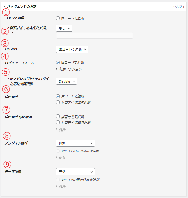 管理画面領域(バックエンド)に国コードで指定してのアクセスや脆弱性攻撃を遮断することができます。