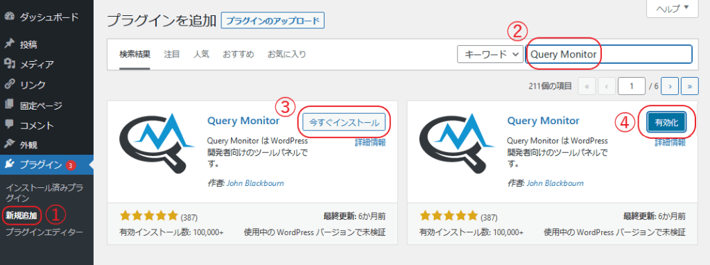 WordPress管理画面より「①プラグイン欄:新規追加」→「②キーワードに【Query Monitor】と入力」→「③【今すぐインストール】」→「④【有効化】」の順に選択しプラグインの有効化しましょう。