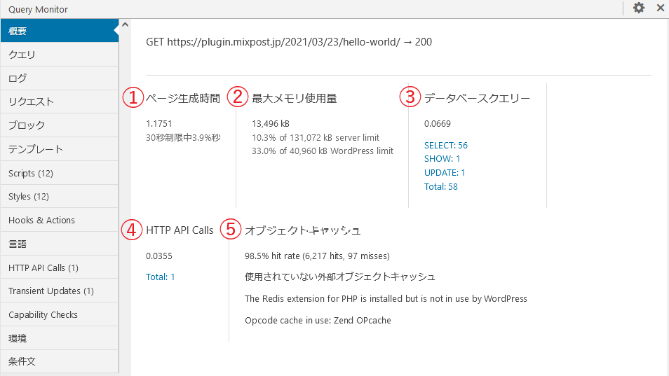 以下のデバッグ情報(Webサイトの各種パフォーマンス)などを簡単に確認することができ、