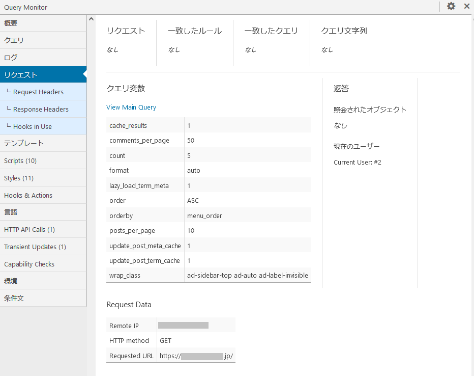 リクエスト機能は、現在のユーザーのクエリ変数を表示し、カスタムクエリを強調表示します。