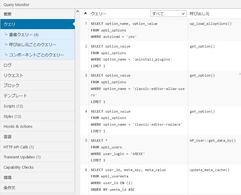 サイト上のどの「プラグイン」、「テーマ」などや関数がデータベースクエリを最も多く