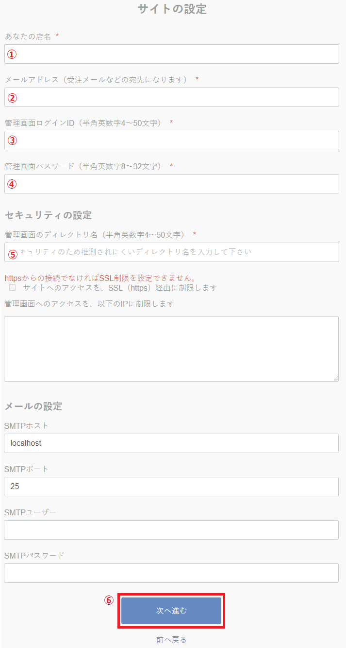 4.以下画像の①~⑤を入力し、「次へ進む」をクリックしてください。