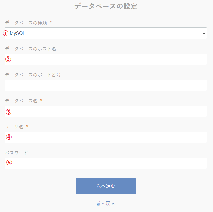 ③データベース名:データベース作成時に設定したデータベース名を入力してください。