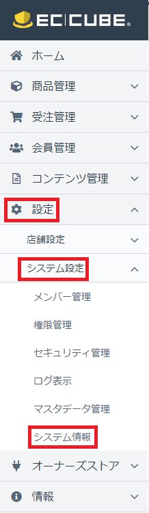 2.左のメニューから「設定」⇒「システム設定」⇒「システム情報」をクリックします