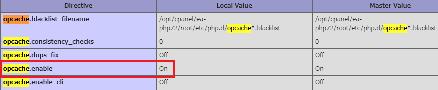 3.「opcache.enable」の「Local Value」の値がOnになっていることを確認します。