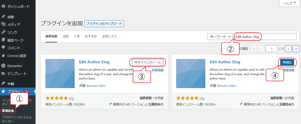 WordPress管理画面より「①プラグイン欄:新規追加」→「②キーワードに【Edit Author Slug】と入力」→「③【今すぐインストール】」→「④【有効化】」の順に選択しプラグインの有効化しましょう。