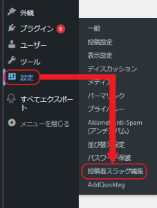 設定画面へは、WordPress管理画面の【投稿スラッグ編集】をクリックし設定画面へ移動しましょう。