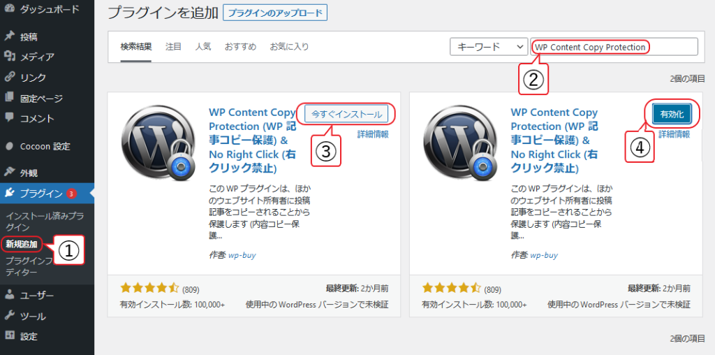 WordPress管理画面より「①プラグイン欄:新規追加」→「②キーワードに【WP Content Copy Protection】と入力」→「③【今すぐインストール】」→「④【有効化】」の順に選択しプラグインの有効化しましょう。