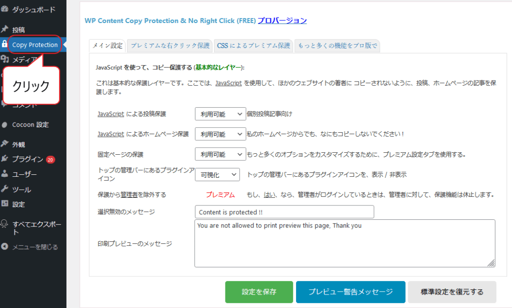 設定画面へは、WordPress管理画面の【Copy Protection】をクリックし設定画面へ移動しましょう。