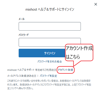 ウィンドウ下部に【mixhost ヘルプ&サポート を初めてご利用の方: アカウント登録】から「アカウント登録」をクリックして