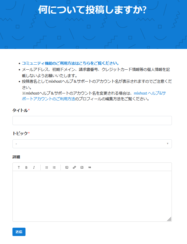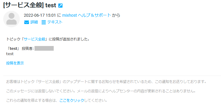 ※投稿者名としてmixhostヘルプ&サポートのアカウント名が表示され「マイプロフィールの編集」から変更可能です。