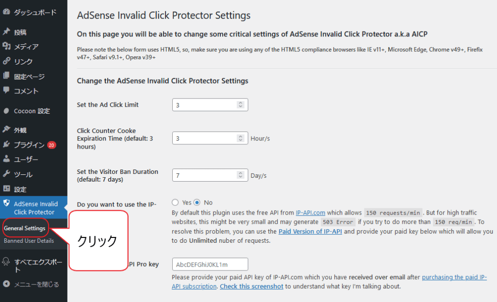 設定画面へは、WordPress管理画面の【AdSense Invalid Click Protector欄:General Settings】をクリックし設定画面へ移動しましょう。