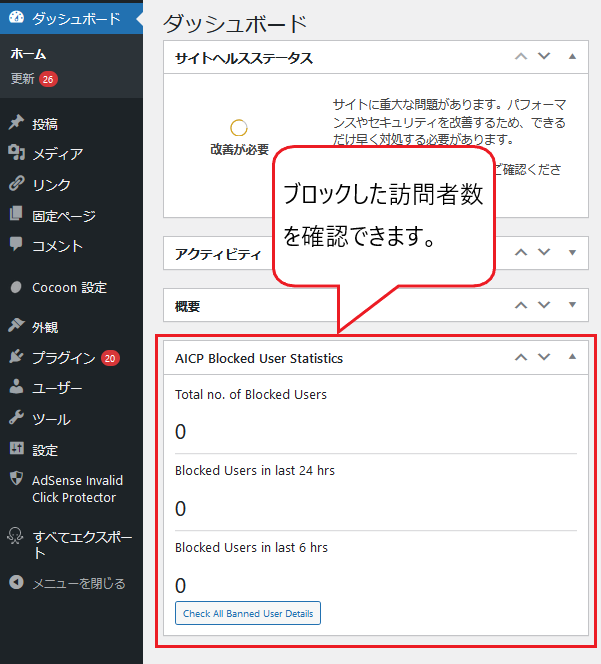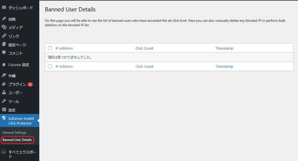 WordPress管理画面の【AdSense Invalid Click Protector欄:Banned User Details】から確認することができ、