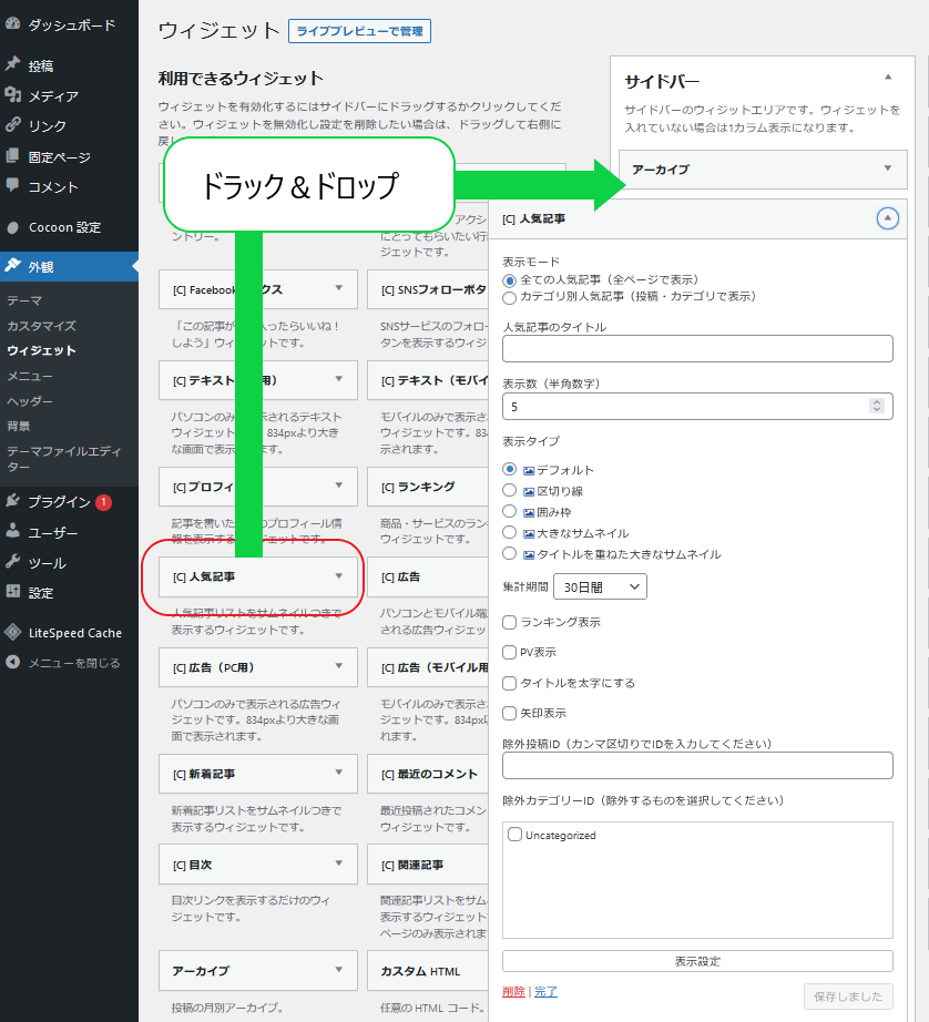 ドロップ&ドロップで挿入し表示設定を保存すれば人気記事一覧の追加は完了です。