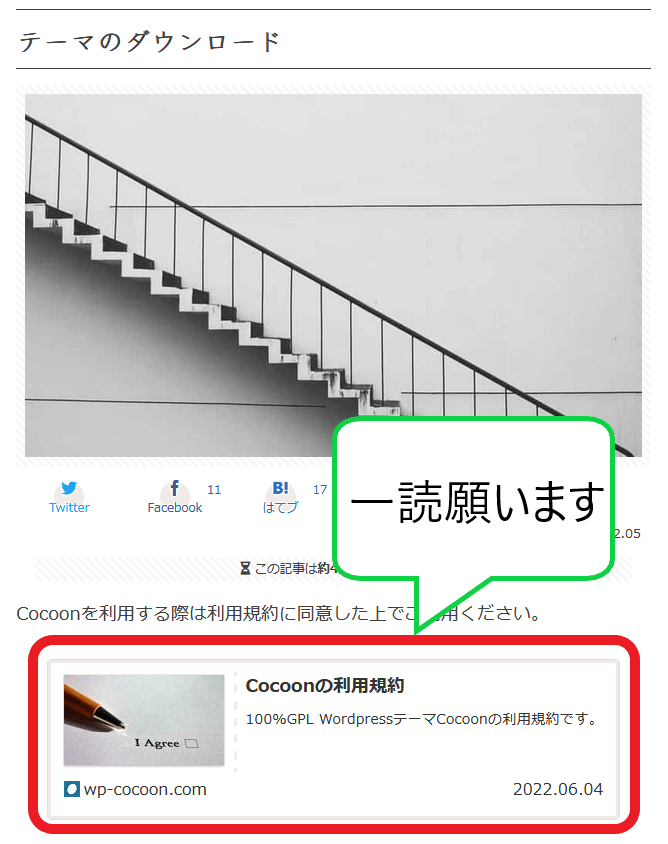 1.にてアクセスしたダウンロードページにて【Cocoonの利用規約】を開き、Cocoonは、商用・非商用を問わず無料で利用可能ですが