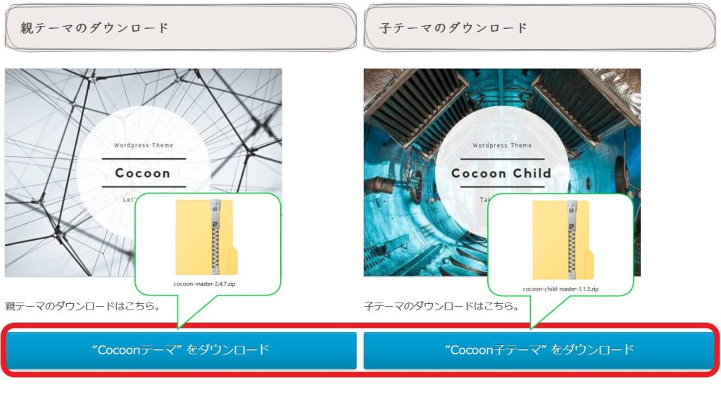 3.Cocoonの親テーマと子テーマをダウンロードしましょう。