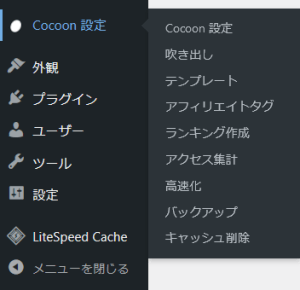 テーマを有効化すると、WordPressの管理画面にCocoon設定が追加されここからCocoonの各種設定を行うことができます。