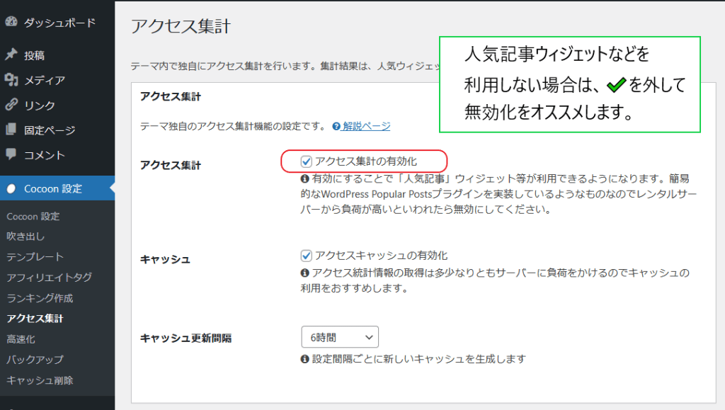 この機能について利用する予定が無い or 使用しているが停止したい場合は【Cocoon設定欄:アクセス集計】の設定画面にて、