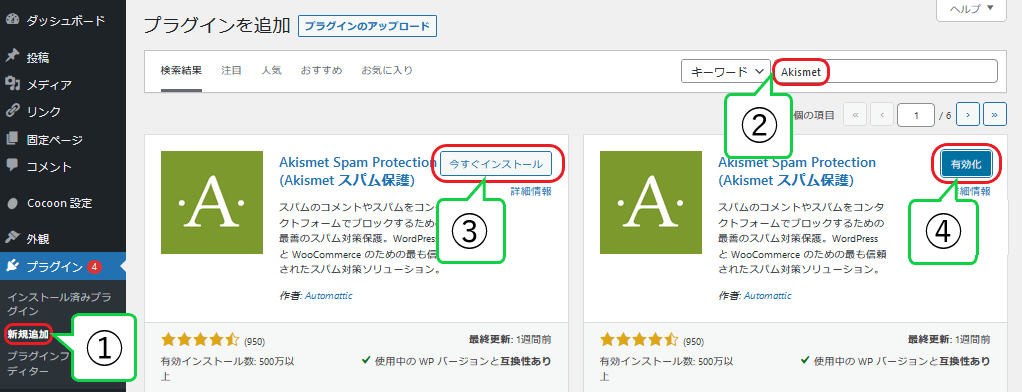 WordPress管理画面より「①プラグイン欄:新規追加」→「②キーワードに【Akismet】と入力」→「③【今すぐインストール】」→「④【有効化】」の順に選択しプラグインの有効化しましょう。
