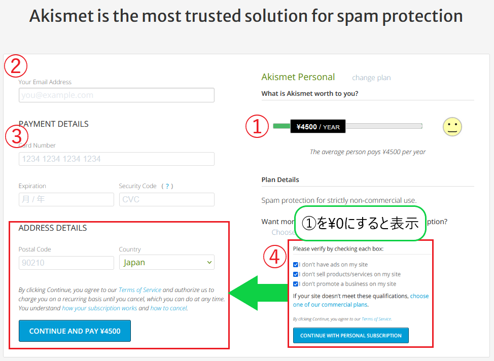 ①にて無料版での利用とする場合は、支払い価格を\0円/年にまでスライダー左へ動かすと表示が切り替わり④の利用条件に対する確認項目が表示されますので、