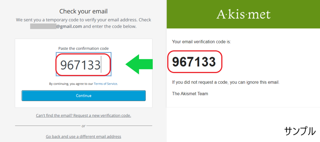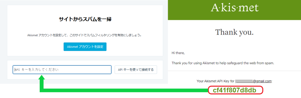 5.にて確認コードを入力後にAPIキーをメールにて送信されますので、これをWordPress管理画面の【設定欄:Akismet Anti-Spam(アンチスパム)】にある