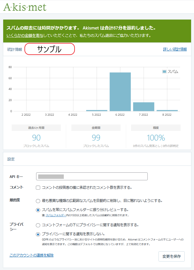 APIキーが正しく接続されていれば以下の画像のように設定項目が表示され、プラグインによるスパム報告の統計情報を確認できるようになります。