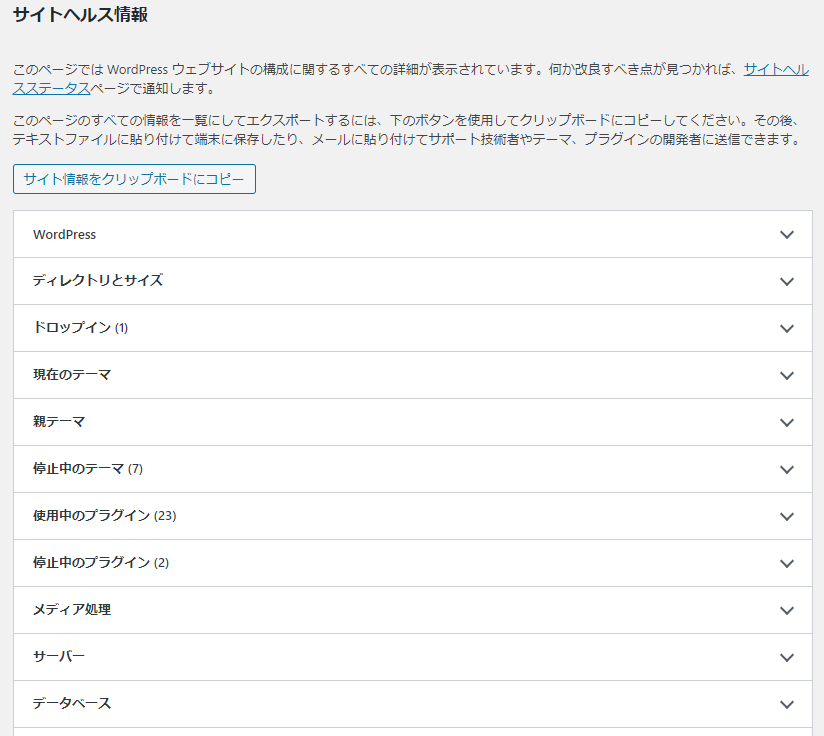 「情報」タブではWordPressのバージョン情報やテーマ・プラグインの情報