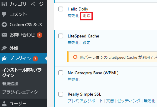 有効化されていないプラグインがある場合、「削除」ボタンが表示されますので削除してください。