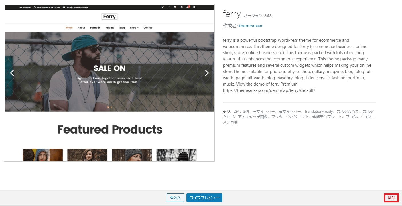 - 使用していないテーマの場合、右下に「削除」ボタンが表示されるのでクリックしてください。