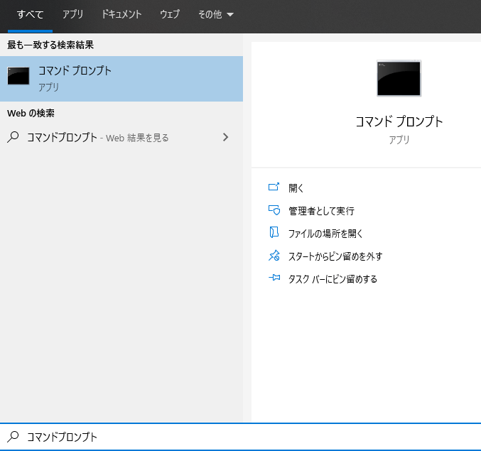 スタートメニューをクリックし、「コマンドプロンプト」と入力すると検索することができます。